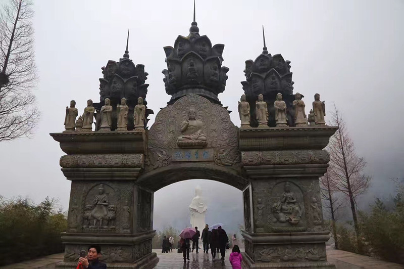 华藏世界门,这座气度不凡的山门上雕刻着佛、菩萨、飞天和金刚力士等雕像,神圣壮观。山门上方有三朵锻铜铸做巨大莲花,花瓣展向八方,毎朵莲花的花瓣上,都刻有一尊不同的佛手工艺造像,代表了佛门的一个思想“一花一世界,一叶一如来”。