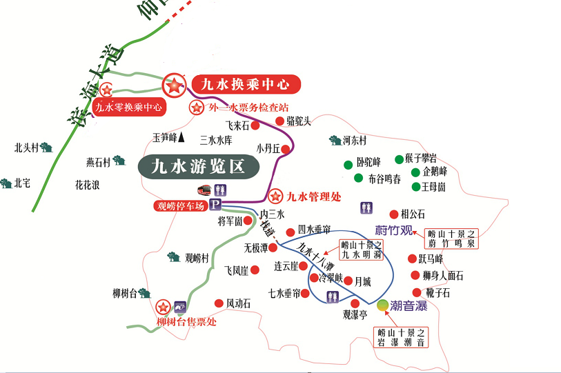 路线:观崂停车场——木栈道——内三水——无极潭——冷翠峡——七水垂帘——观瀑亭——潮音瀑——蔚竹观,主要景点“九水十八潭”以及各种象形石大多集中在这条线路上。