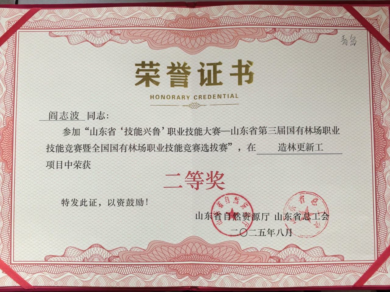 7月23-24日,山东省“技能兴鲁”职业技能大赛—山东省第三届国有林场职业技能竞赛在淄博原山林场成功举行,崂山林场代表青岛市参加本次技能竞赛,经过两天的激烈角逐,流清林区阎志波、夏庄林区黄克熠取得优异成绩,荣获造林更新工项目个人二等奖。