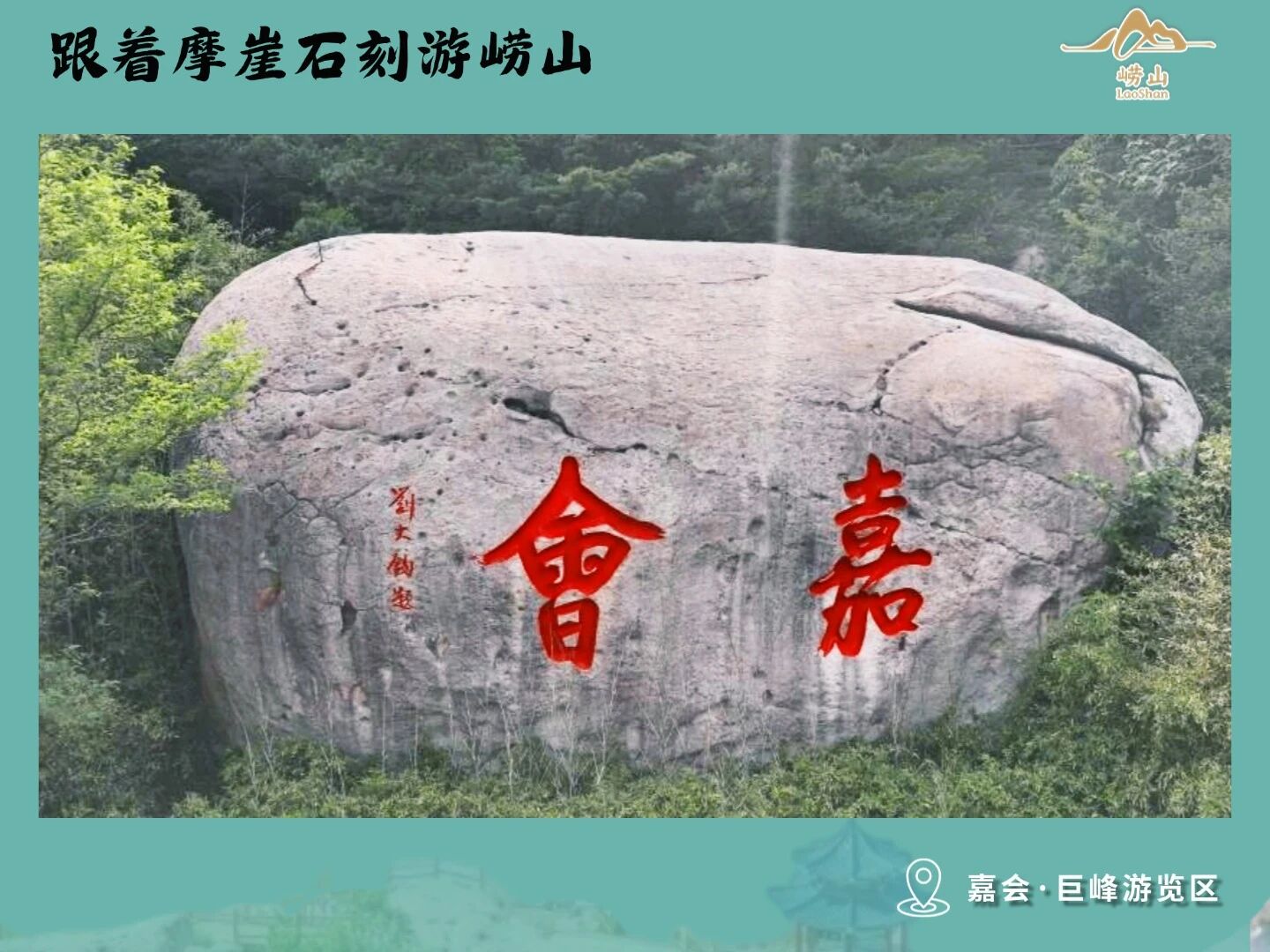 ②“嘉会”语出《易经》:“体仁足以长人,嘉会足以合礼。”一方面指游客来到崂山,来到巨峰,心灵回归自然,构成一种和谐,另一方面指来自五湖四海的嘉宾在这里会聚。同时,它还代表了历代高僧名道、显宦明达都曾来到崂山,在崂山的历史上留下足迹,成就了千载人文崂山,这些历久弥新的人文脉络给崂山带来了一种嘉祥的气场,这块巨石也成为游人拍照留影的“神石”,给心怀虔诚的游人以福泽。