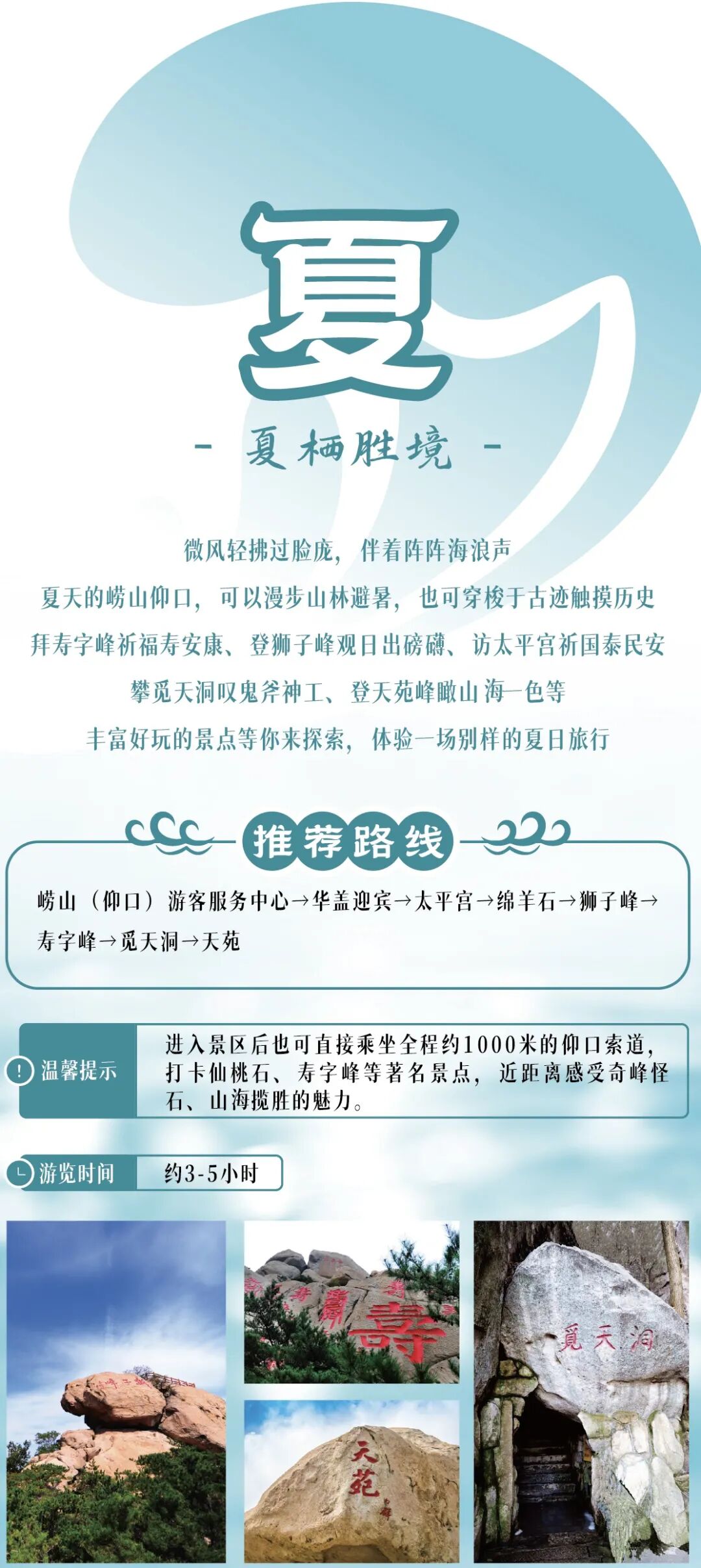 盛夏的崂山,是自带降温属性的避暑秘境!海风送凉、溪瀑奔涌,兼顾山水清爽与滨海野趣,酷暑天直接爽到飞起~游览完九水,还可以换乘景区观光车前往华楼游览区,探幽奇石,寻古石刻,畅游山水间!