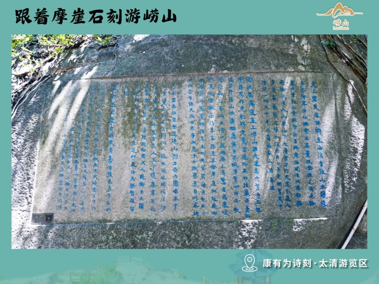诗刻记录了康有为在1923 年游览崂山时的所见所感,是了解康有为晚年生活、思想状态以及他与崂山之间深厚情缘的重要历史资料。作为存世最长的康氏摩崖,既载晚年思想轨迹,亦展碑学宗师风范。邓小平同志1979年来崂山视察时,曾在此看了足有一刻钟的时间,然后肯定地说:“这是康有为的真迹!”