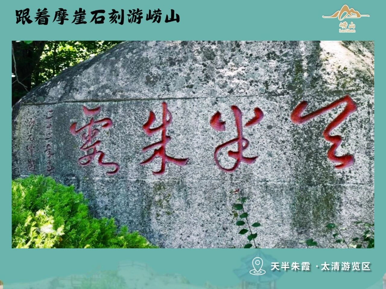 亮点:题刻既是对崂山朝霞的意境捕捉,也是对动荡年代文人精神的写照。此作草书章法借鉴《书谱》,转折处见北碑力度,其草书流畅自然,笔势如霞光舒展,与崂山的山势形成美学呼应。值得一提的是,所刻这四个字为回文体,即可读作“霞朱半天”,亦可读作“天半朱霞”,其意思都是指朝霞映红了半边天。